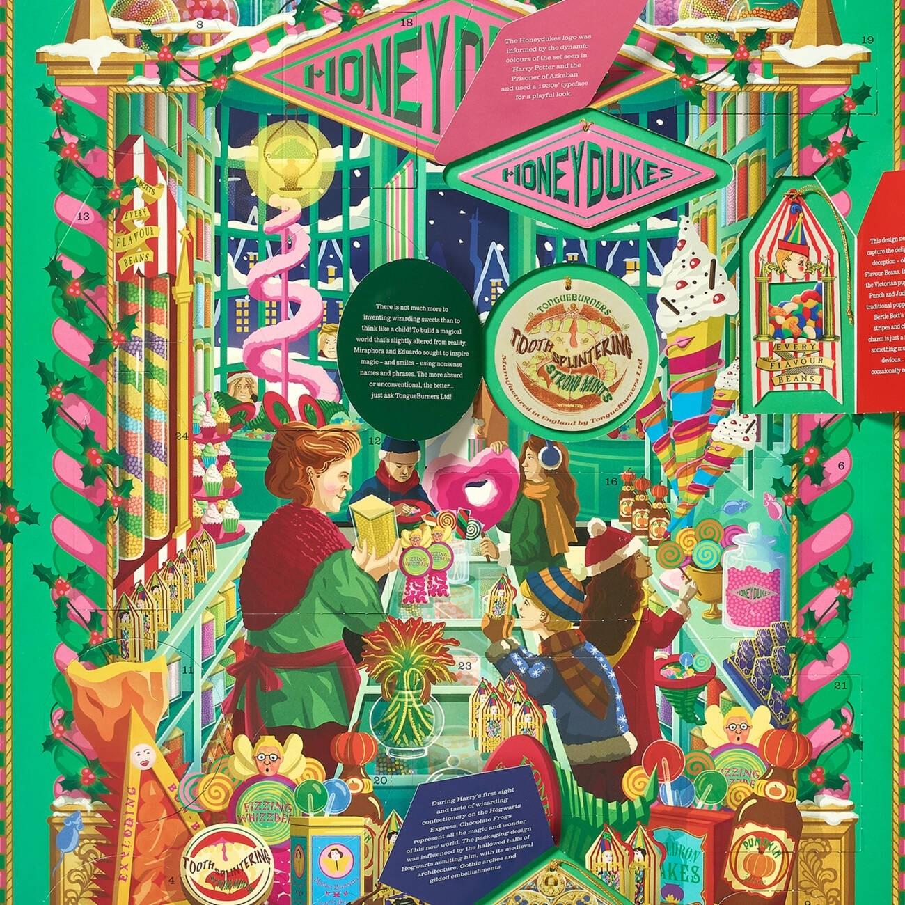 Calendrier de l’Avent avec 24 décorations papier inspirées de l’univers Honeydukes.