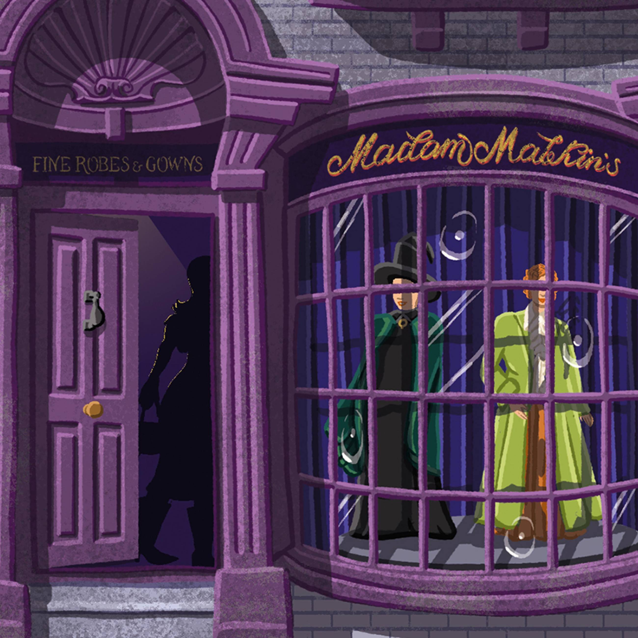 Arrêtez-vous à la boutique envoûtante de Robes pour Toutes Occasions de Madame Guipure, couturière et fournisseur de belles robes, robes et uniformes scolaires de Poudlard. L'élégante devanture violette enchante par sa grandeur et son style, avec des motifs graphiques créés par MinaLima, notamment le logo sophistiqué de Madame Malkin et les publicités du magasin peintes sur la maçonnerie. Alors que les sorcières et les sorciers parcourent les vêtements raffinés dans les étages supérieurs du magasin, les dernières tenues de sorciers à la mode sont exposées dans les vitrines.