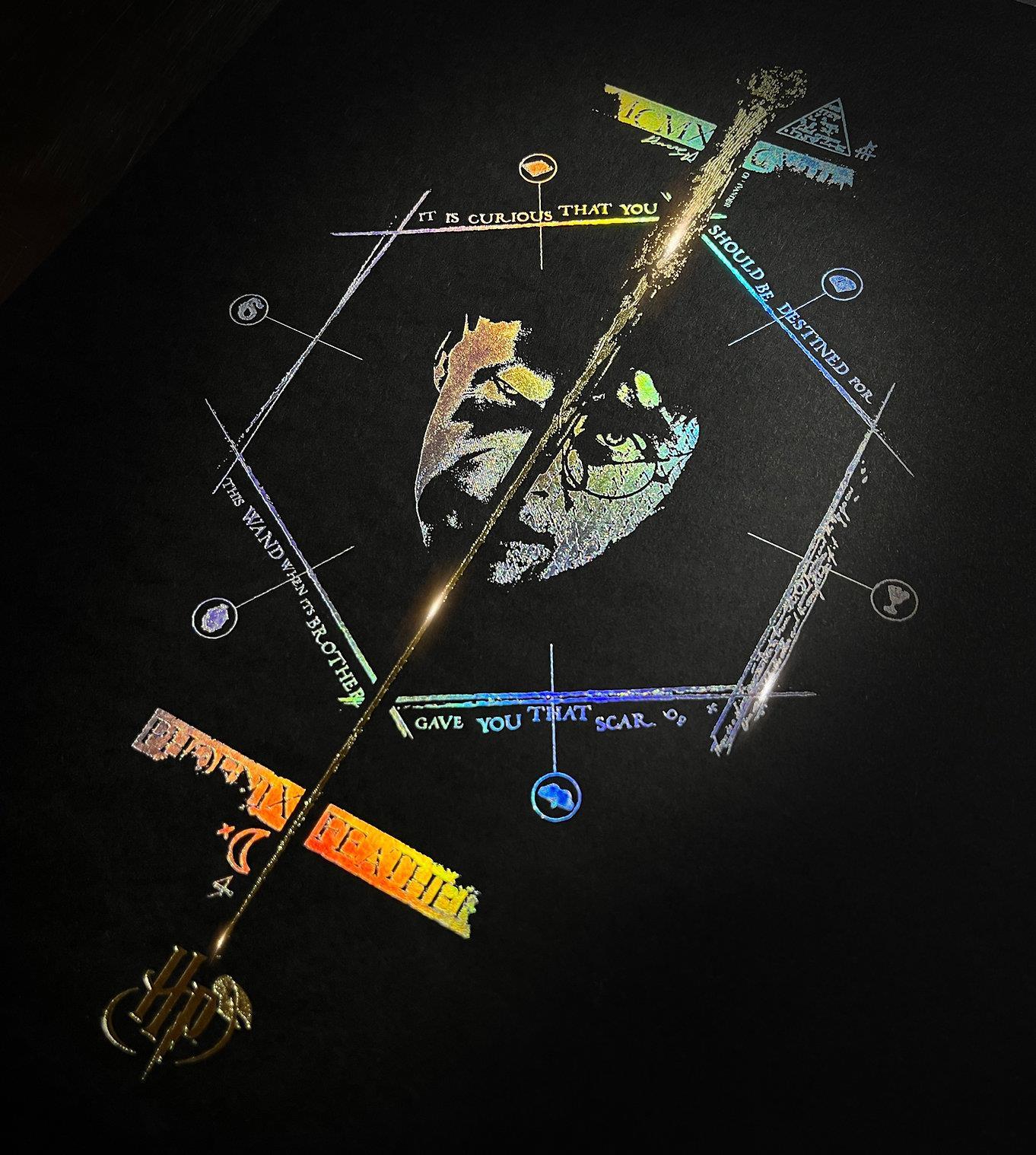 - Dorure à chaud or et holographique : Un duo éclatant qui illumine les silhouettes d’Harry Potter™ et de Voldemort™, rappelant la tension et la magie de leur affrontement.
