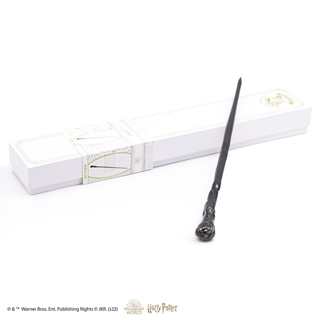 La baguette de Ron Weasley est taillée dans le bois de saule et renferme un crin de licorne. C’est une réplique authentique et officielle de la baguette fabriquée par en verre et peinte à la main par la manufacture Arribas. Elle mesure environ 30 cm.