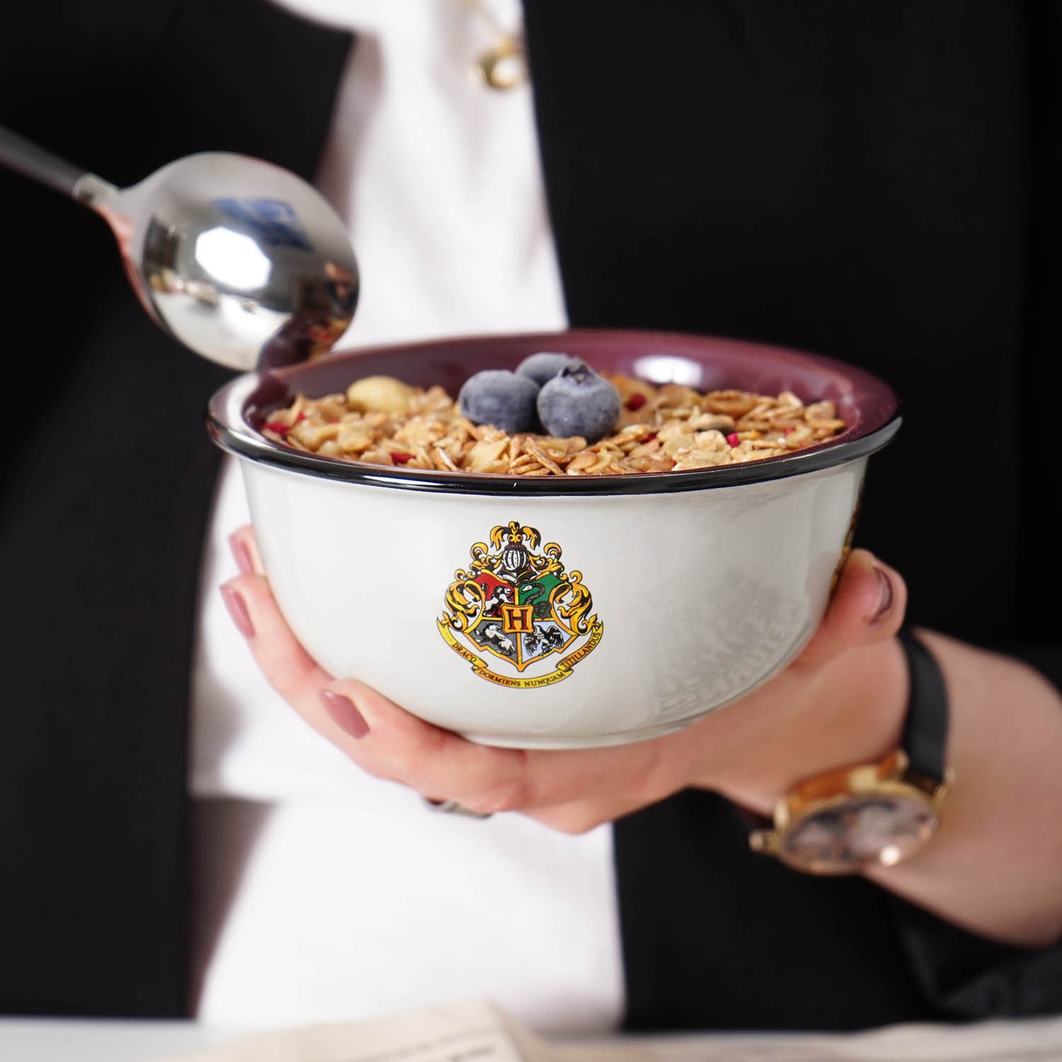 Le bol de céréales Poudlard blason aspect émail 400ml est en céramique. Le bol de céréales Harry Potter présente les armoiries de l'école de sorcellerie de Poudlard quatre fois. Le bol gris clair avec le bord noir est rouge foncé à l'intérieur.