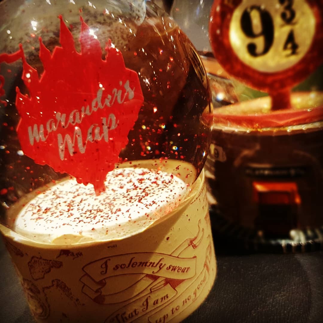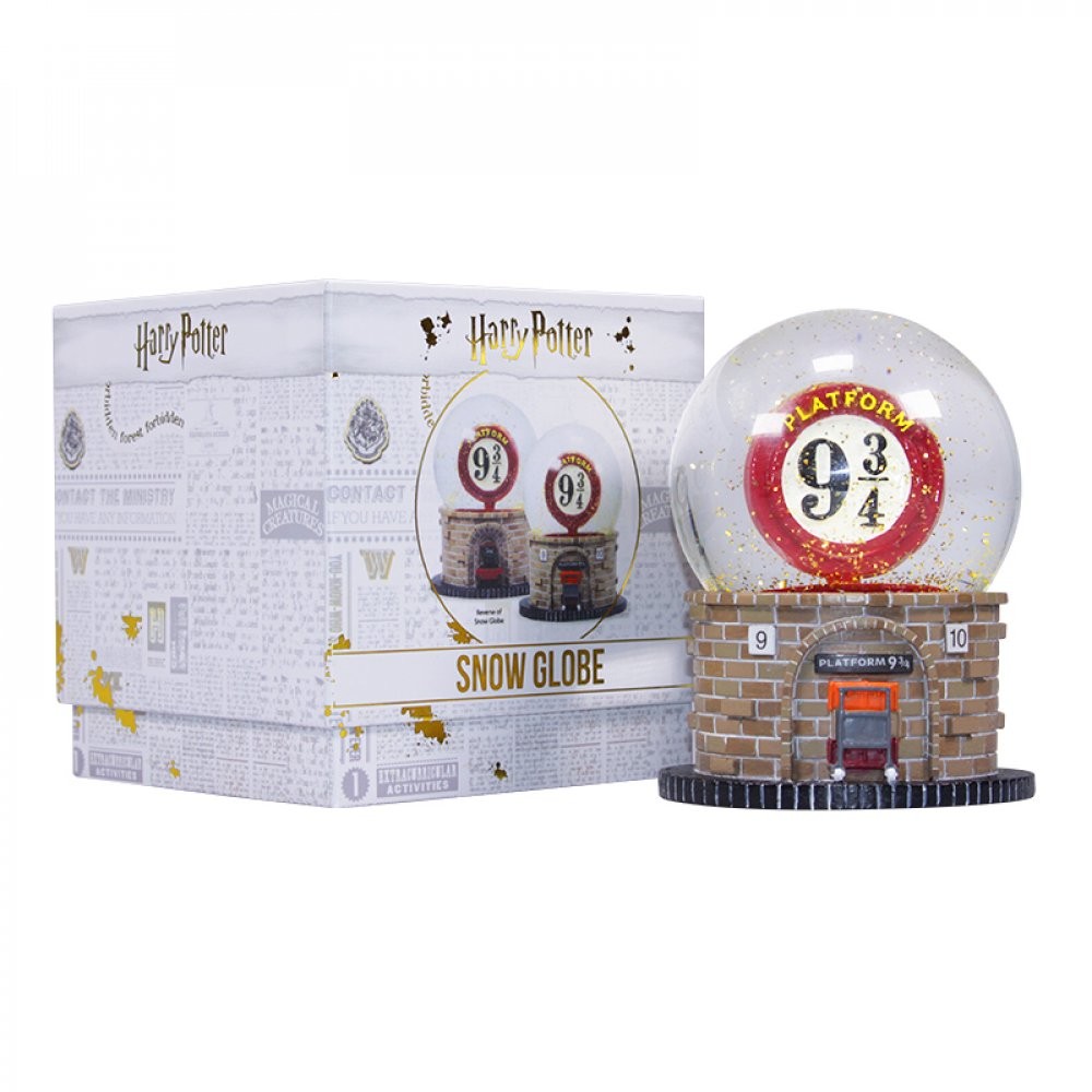 Superbe boule à neige de 65mm de diamètre contenant le logo de la Plate-forme 9 3/4, surplombant une magnifique réplique de la plate-forme elle-même avec l'avant du Poudlard Express.