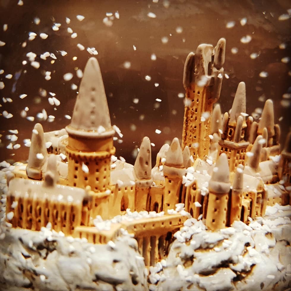 Superbe boule à neige de 10 cm de diamètre contenant une magnifique réplique du château de Poudlard (Hogwarts) sur son rocher, surplombé du blason de l'école de sorcellerie.