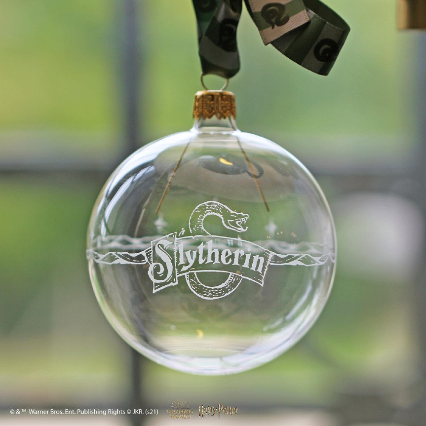 Ajoutez une touche de magie à votre sapin avec cette boule de Noël transparente en verre Arribas, gravée du blason de Serpentard, diamètre 8 cm.