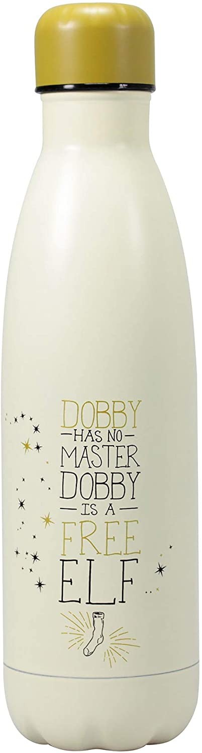Que vous voyagiez à Poudlard ou sur votre lieu de travail ou d'éducation moldu, cette élégante bouteille en métal inspirée de Dobby l'elfe libre est le moyen idéal de rester hydraté pour la journée à venir.