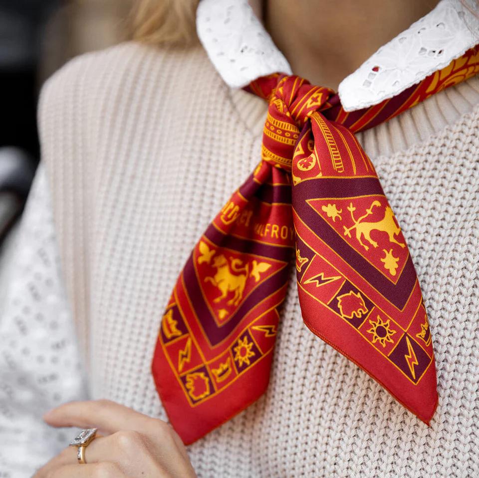 Ce bandana en soie est un hommage aux valeurs de courage. Son design, inspiré des tapisseries de la salle commune, met en scène le Professeur McGonagall, l'épée de Gryffondor et les qualités de la maison inscrites en lettres d'or.