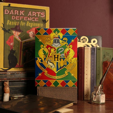 Ce design représente le travail artistique original de l'emblème de Poudlard, vu dans les films Harry Potter™. Il comprends la célèbre devise de l'école "Ne jamais chatouiller un dragon qui dort", et les quatre animaux symbolisant les différentes maisons, sont également représentés.