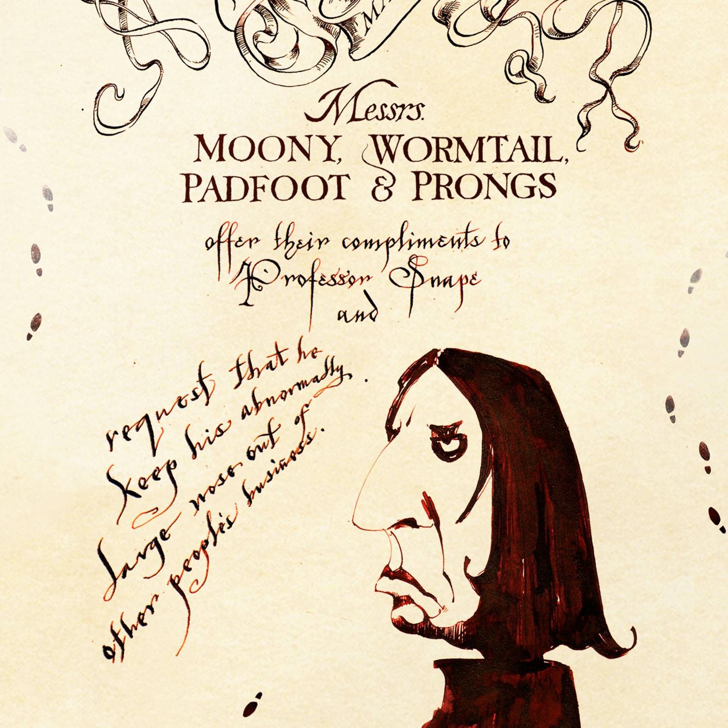La conception MinaLima présente le message insultant des Maraudeurs au professeur Rogue et la caricature qui apparaît lorsque le maître des potions tente de révéler les secrets de la carte.
