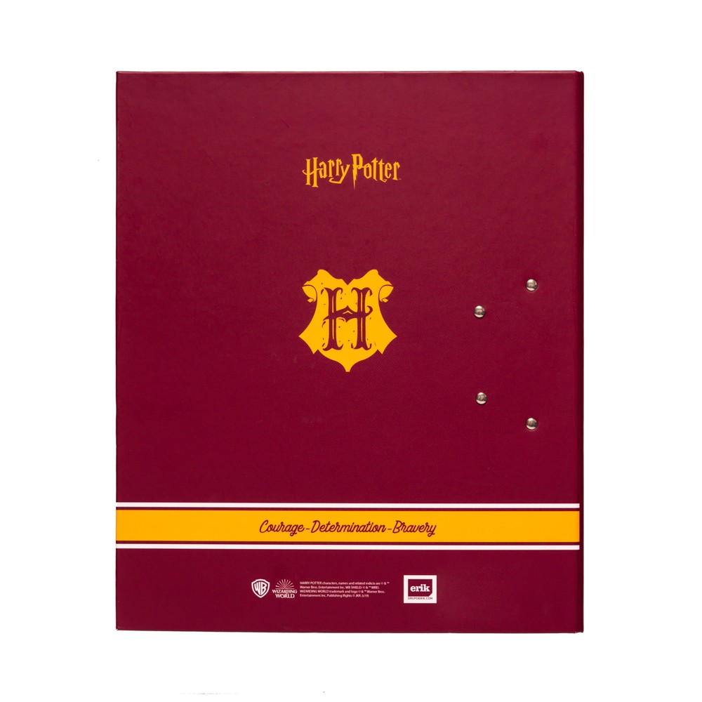 Classeur à 2 anneaux Harry Potter, présente une couverture rigide de 2 mm doublée de papier laminé mat 150 gr, un mécanisme à levier et un compresseur en métal.