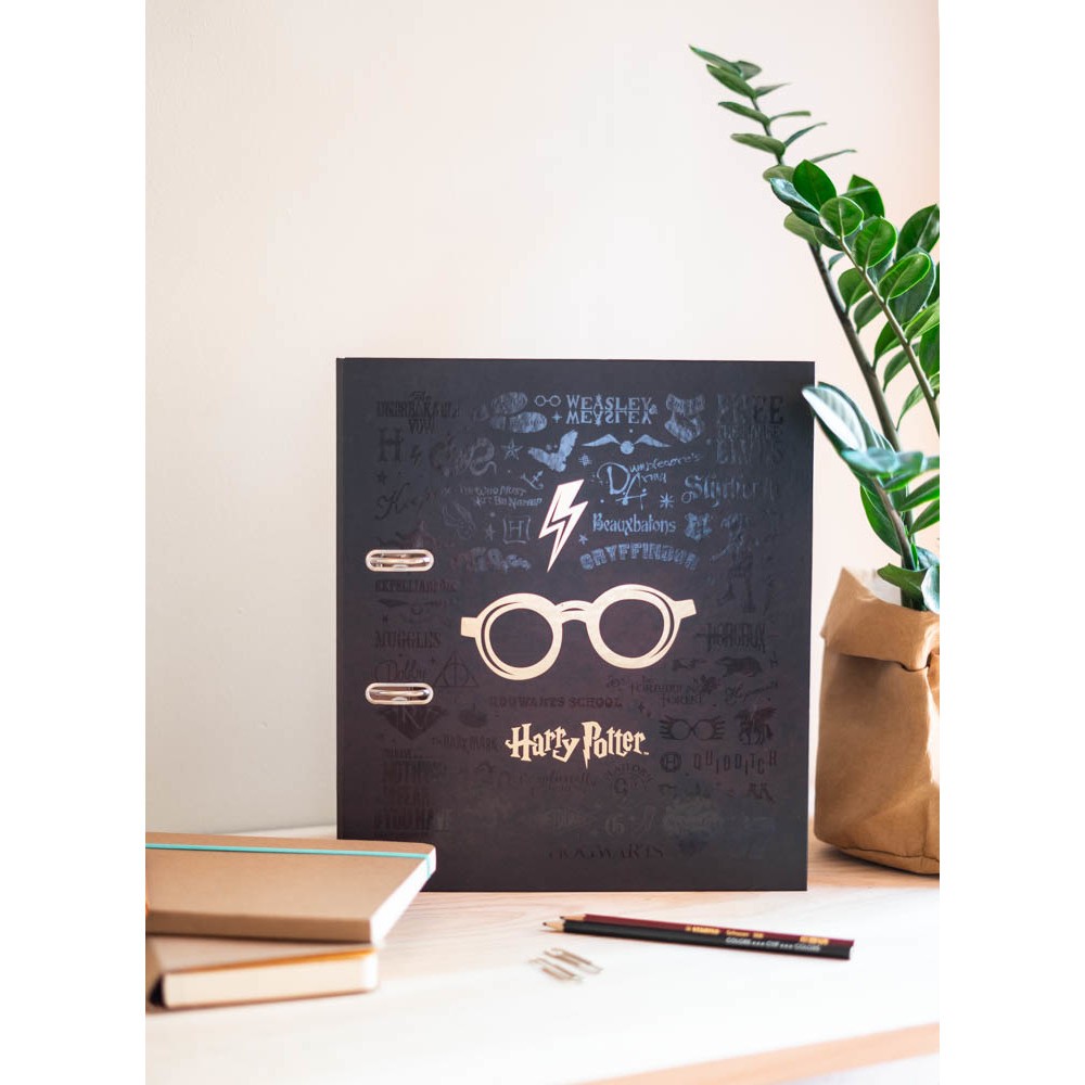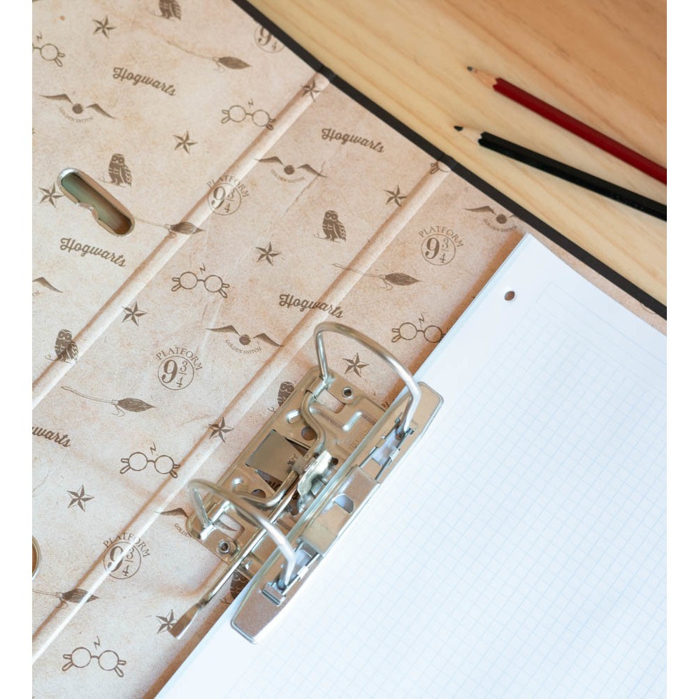 Classeur à 2 anneaux Harry Potter, présente une couverture rigide de 2 mm doublée de papier laminé mat 150 gr, un mécanisme à levier et un compresseur en métal.