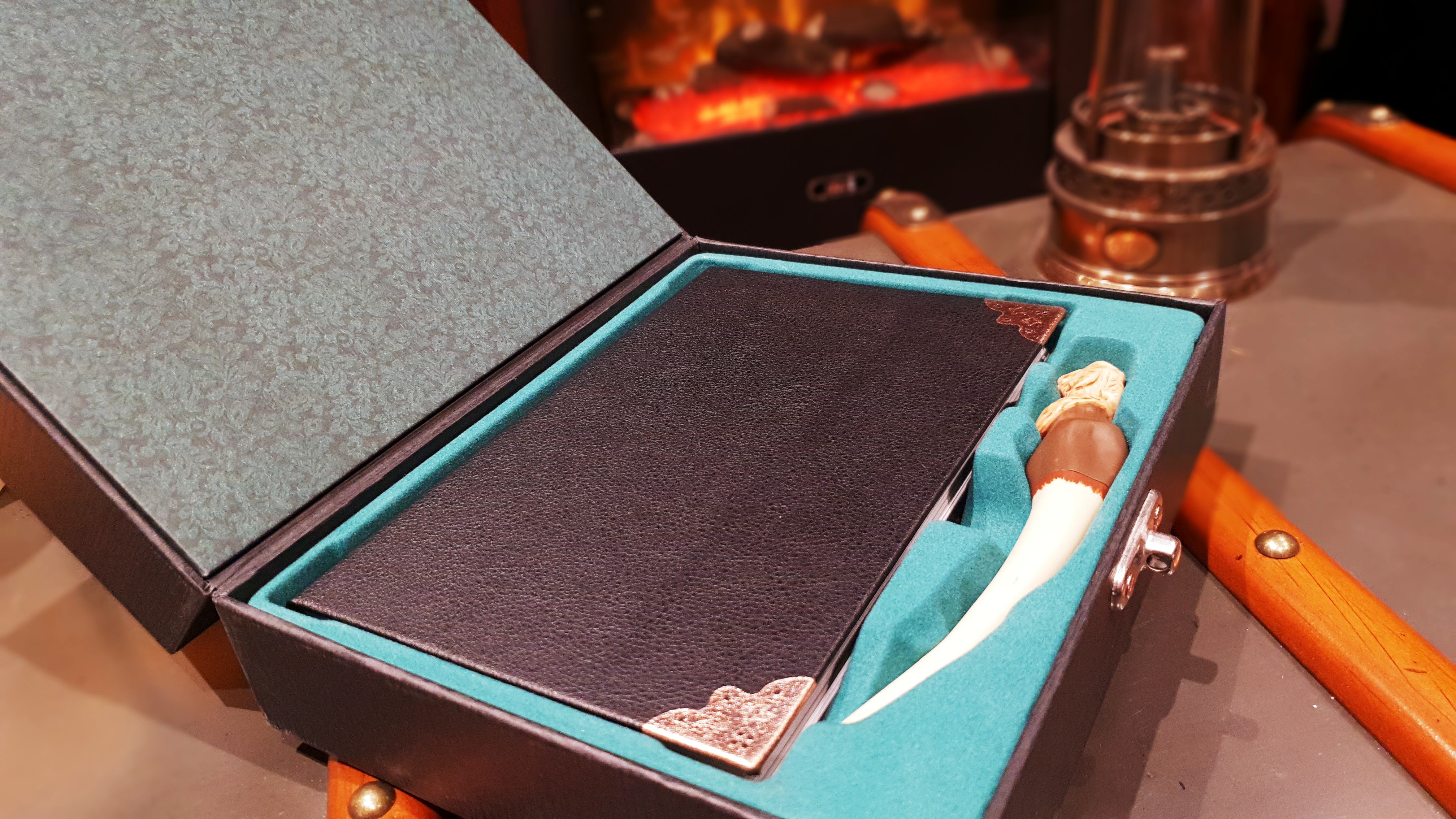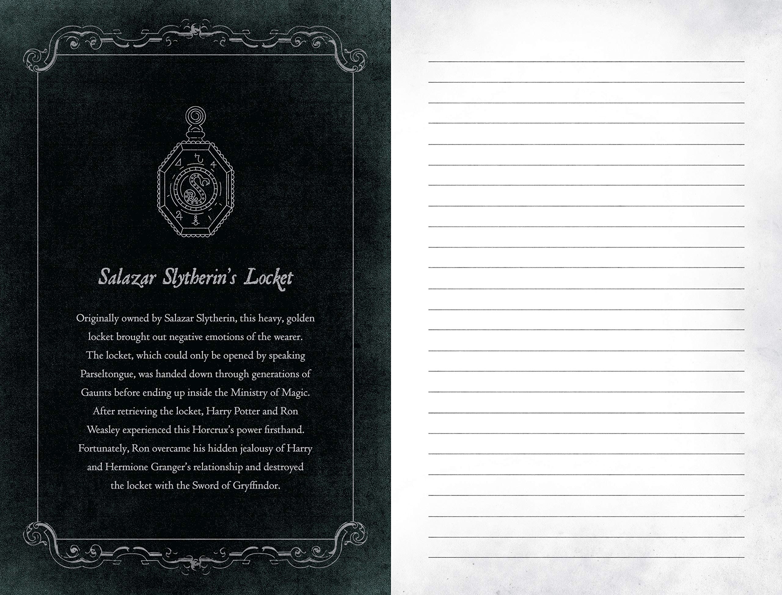 • La réplique du journal intime de Tom Jedusor (Riddle) avec des citations des Forces du Mal, des descriptions des sept horcruxes, des photos et des illustrations, ainsi que beaucoup d'espace (ligné) pour écrire. Le journal comprend également une reproduction des messages entre Harry et Tom Jedusor, comme on le voit dans Harry Potter et la Chambre des secrets. Le journal mesure env. 10 x 20 cm et contient 176 pages.