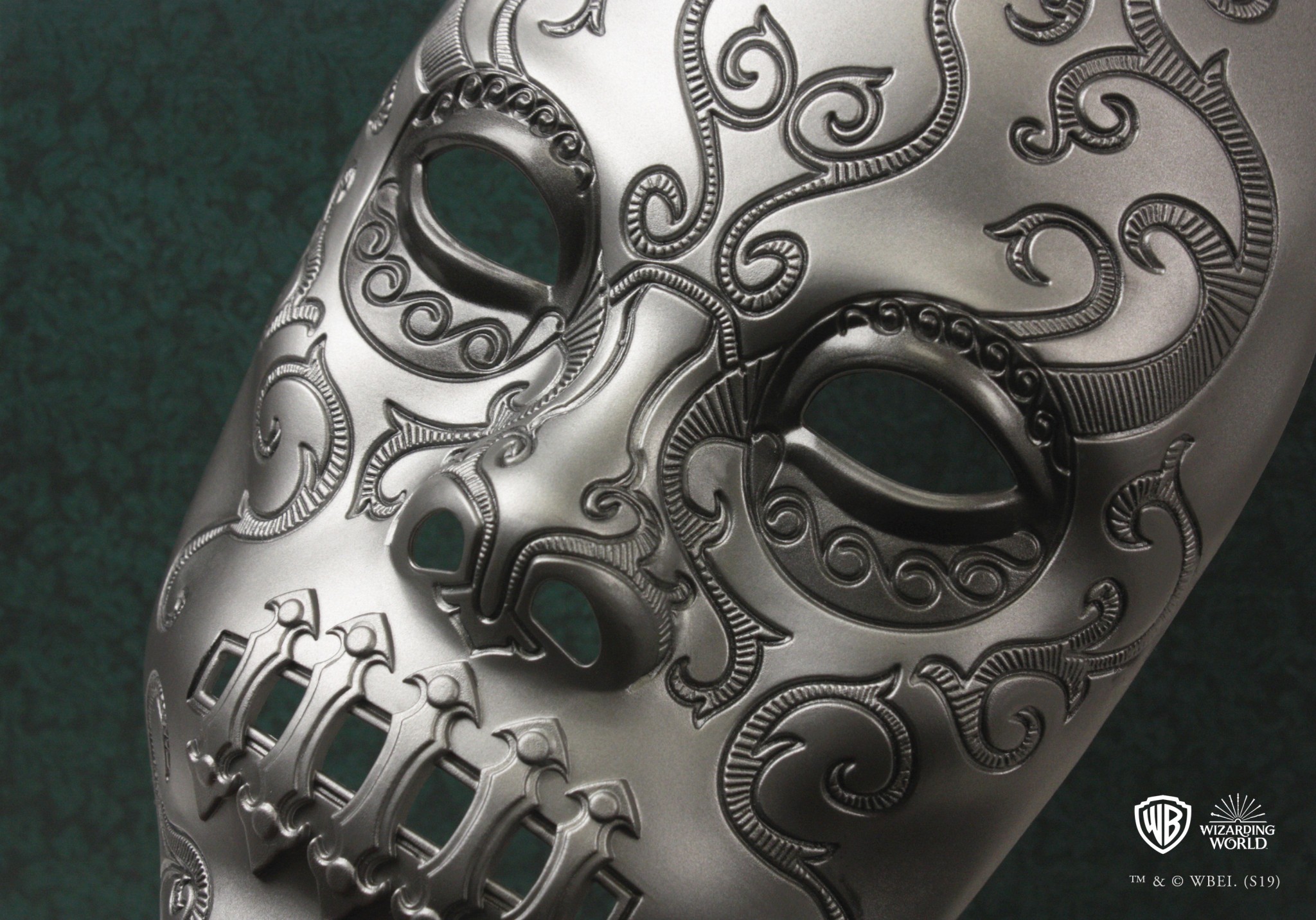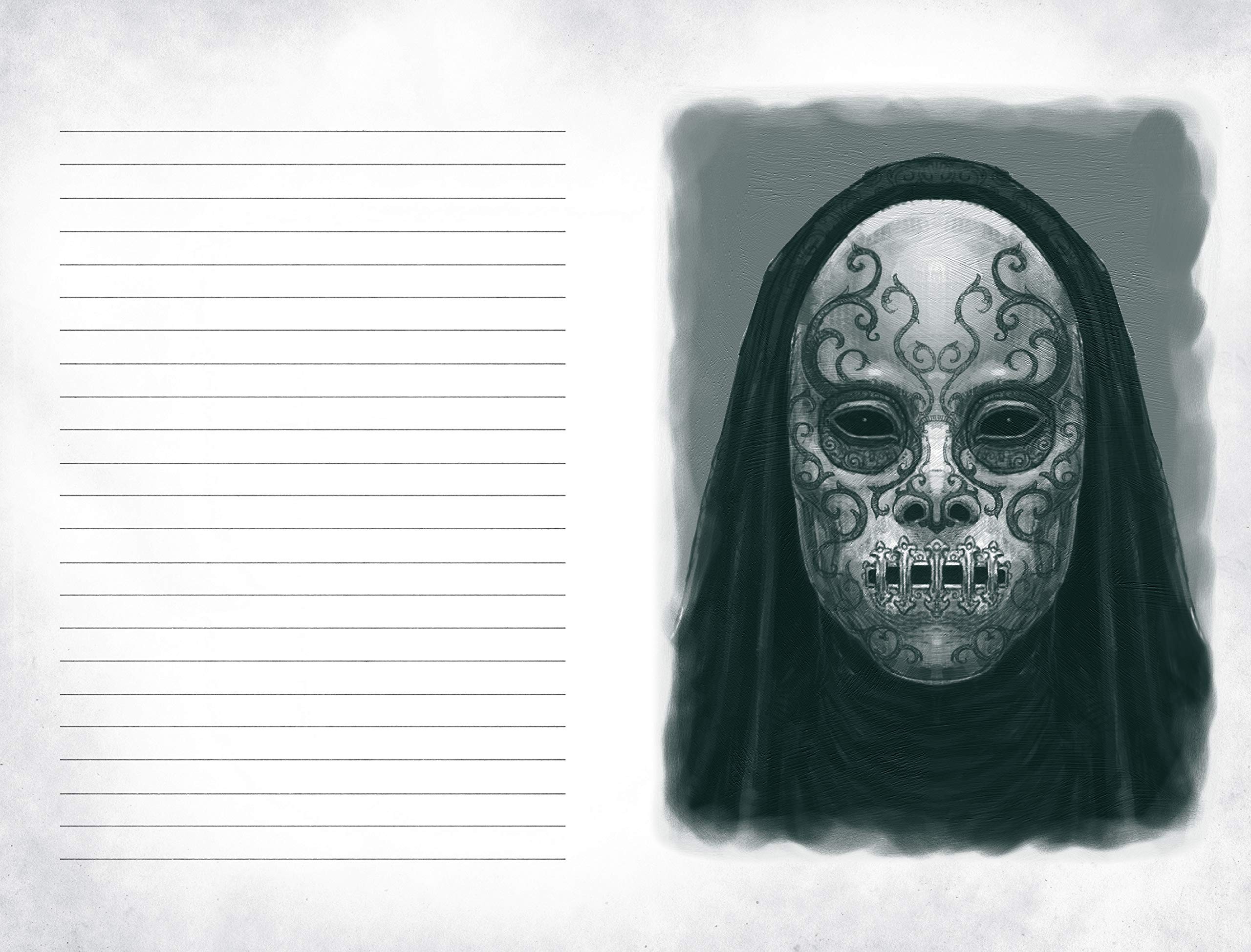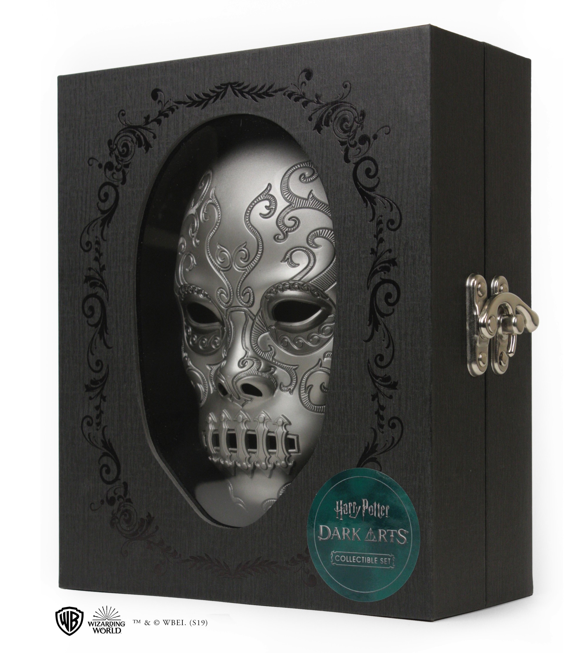 • Un coffret souvenir avec masque de Mangemort de Bellatrix Lestrange moulé et intégré dans la partie supérieure, fermoir chromé. Remarque : le masque mesure env. 10 x 18 cm et bien qu'il soit amovible de la boîte, il n'est pas destiné à être porté.