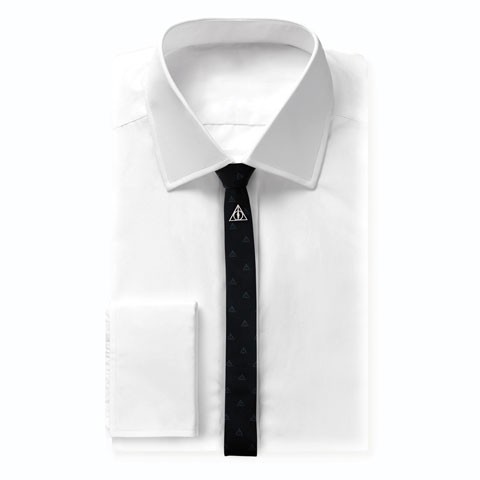 La cravate des Reliques de la Mort se distingue avec une coupe fine à la française, sur laquelle sont brodés les symboles des reliques de la mort. Cette cravate tissée apporte une touche d’élégance à vos tenues de soirée, comme à celles du quotidien. Avec cette cravate Harry Potter, vous insufflez de la magie au bureau (et en toute discrétion, attention aux moldus tout de même…). Les plus ambitieux peuvent même accrocher le pin’s Reliques de la Mort sur la cravate, avec les trois symboles :