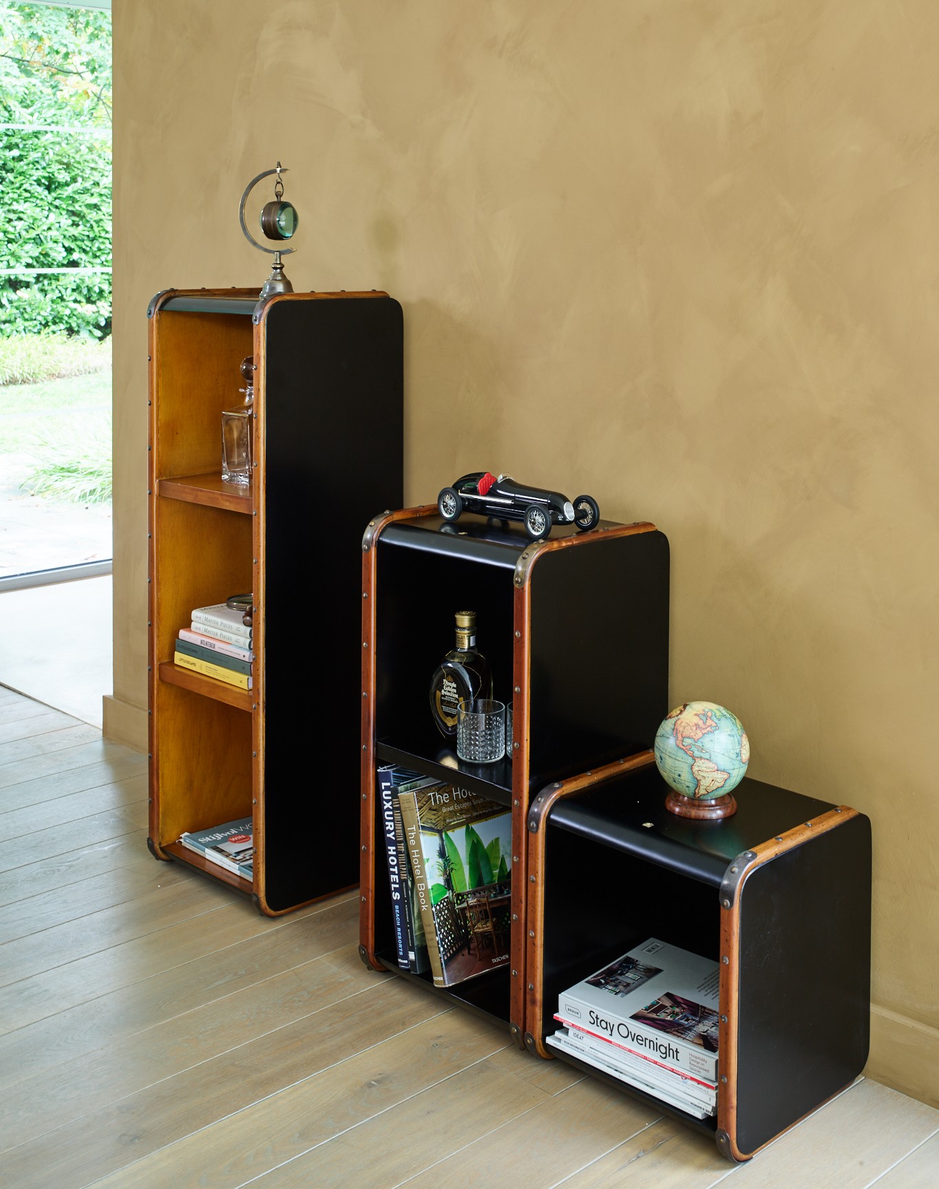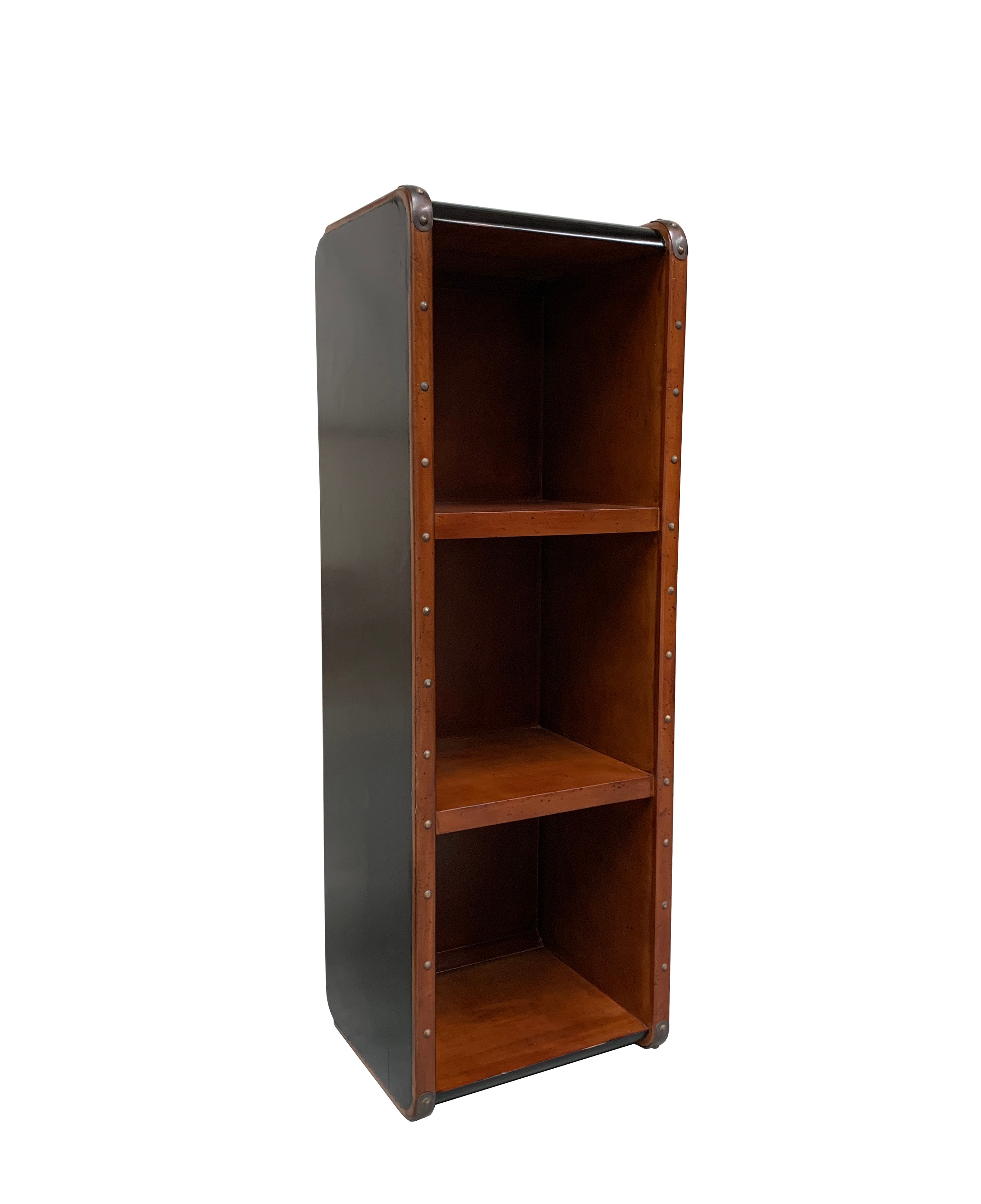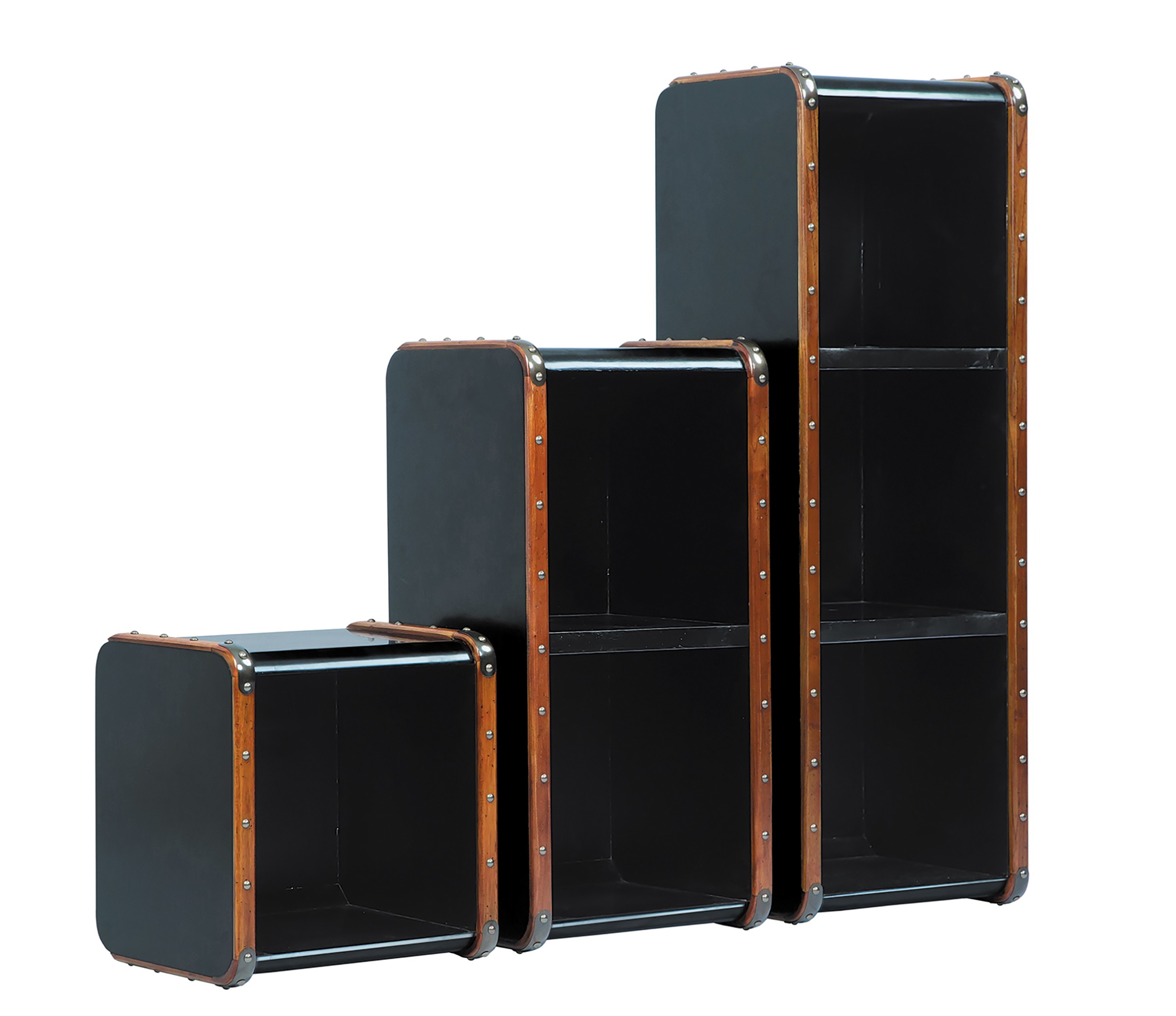 Étagère de style malle de voyage, en merisier et laiton, de trois formats différents.