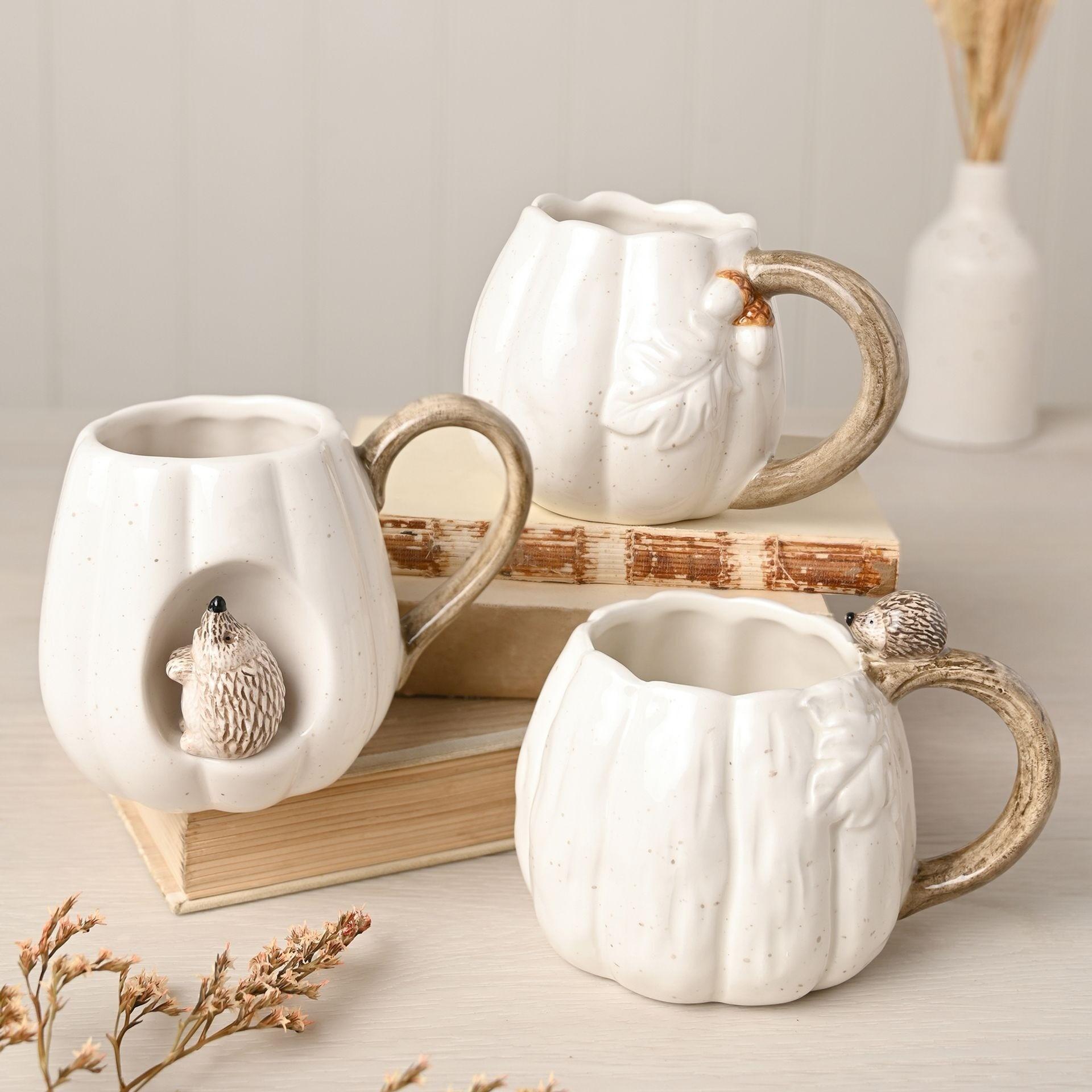 Tasse en céramique en forme de citrouille blanche avec un adorable hérisson sur l’anse. Parfaite pour les amoureux de l’automne !