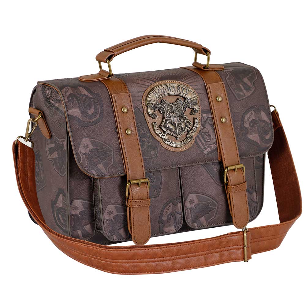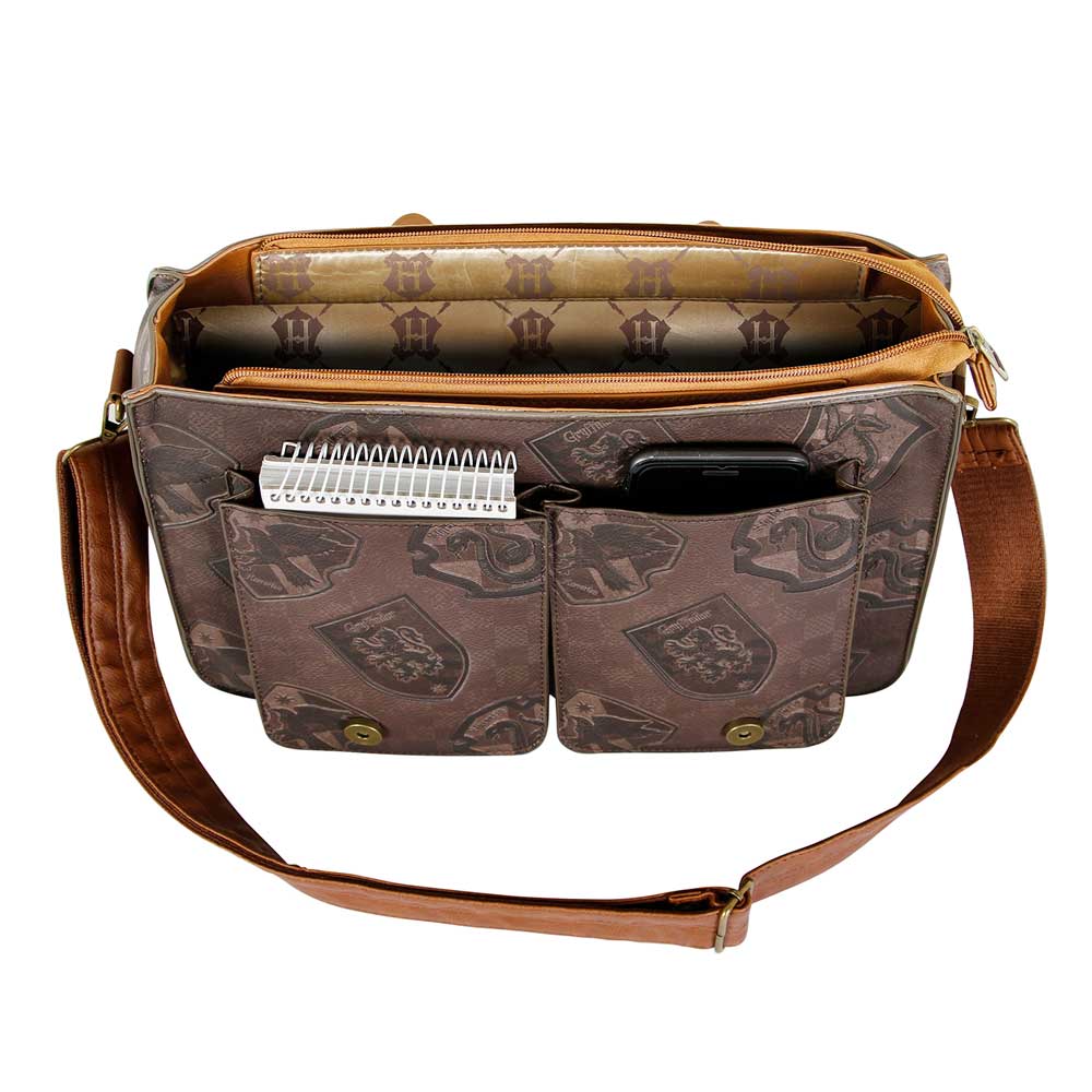 Sac brun Harry Potter spacieux avec multiples compartiments, rabat magnétique et bandoulière ajustable.
