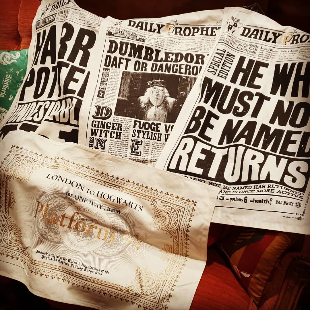 Un torchon Harry Potter inspiré de la une choc du Daily Prophet, avec dorures magiques.