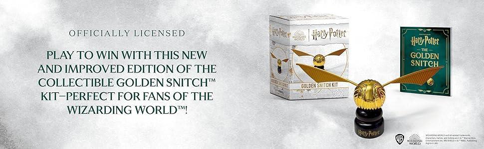 Réplique dorée du Vif d’Or avec ailes détachables, socle en bois et livret illustré inclus.