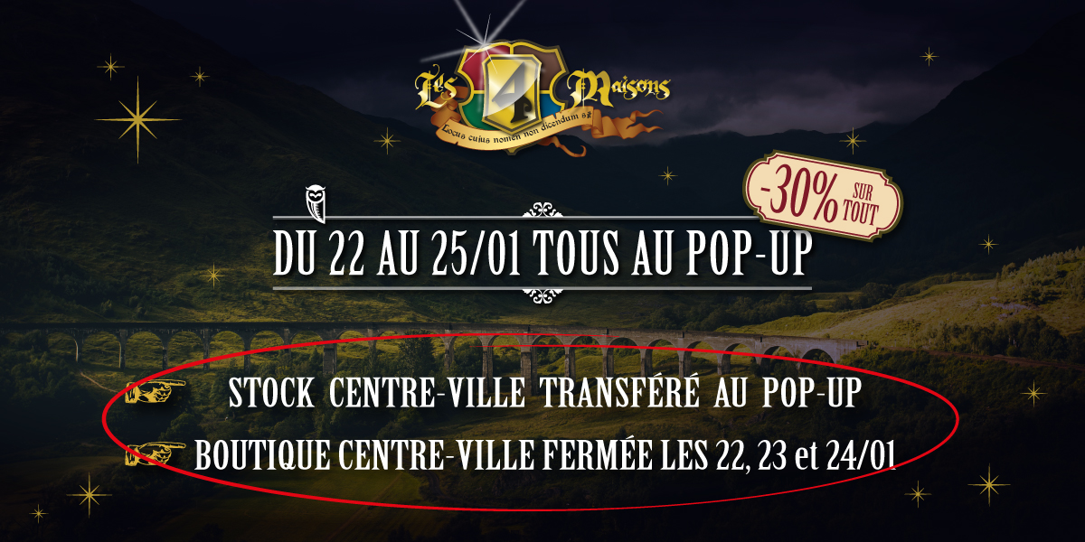 Une vague de magie et de bonnes affaires arrive au Pop-Up Harry Potter Des 4 Maisons ! Pendant que notre boutique Harry Potter du centre-ville sera exceptionnellement fermée pendant 3 petits jours, nous vous réservons une offre ensorcelante au Pop-Up : 30% de remise sur absolument tout le stock, du mercredi 22 janvier au samedi 25 janvier inclus.