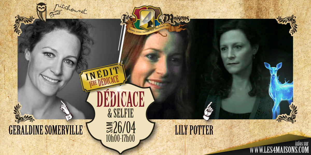 Le samedi 26 avril 2025, nous avons l'immense honneur d'accueillir Geraldine Somerville dans un premier temps, l'interprète inoubliable de Lily Potter (ainsi que l'interprète de James Potter plus tard dans l'année), pour une journée de dédicaces de 10h00 à 17h00. Ce moment s'annonce absolument unique et historique, car il s'agit de la toute première séance de dédicaces de l'actrice dans le monde. Une occasion inédite pour tous les fans de l'univers Harry Potter, et une chance inouïe de la rencontrer en personne.